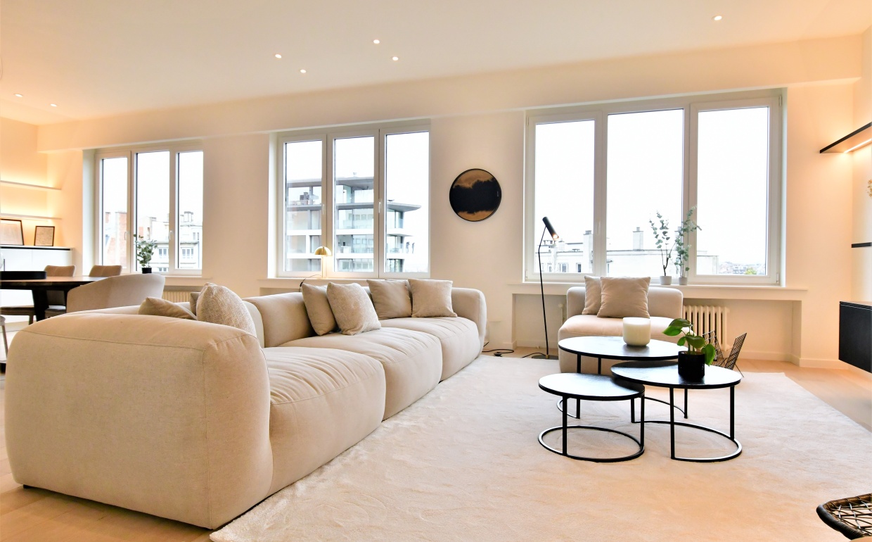 Brussel brengt altijd mooie uitdagingen met zich mee. Prachtige historische panden met luxueuze projecten zoals deze. Dit stijlvol interieur werd op maat samengesteld om dit appartement in te richten functie van verkoop.